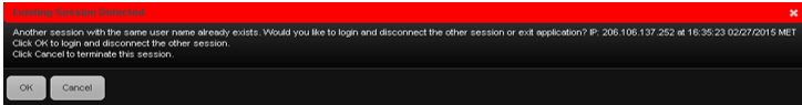 If this situation occurs, a message appears when you try to login. The message displays the IP Address of the other session and OK and Cancel buttons.