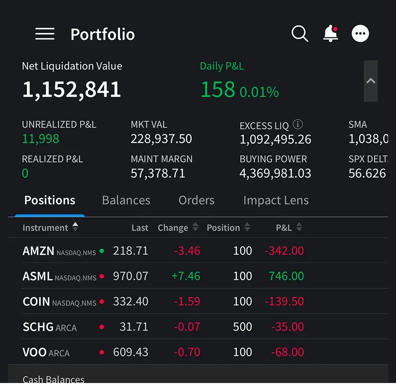Track performance, monitor positions, and adjust your investments from anywhere. IBKR Mobile provides the insight and control of professional desktop tools so you can make informed decisions and act quickly, even on the go.